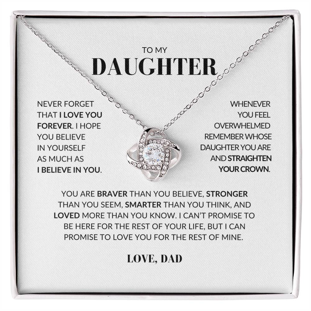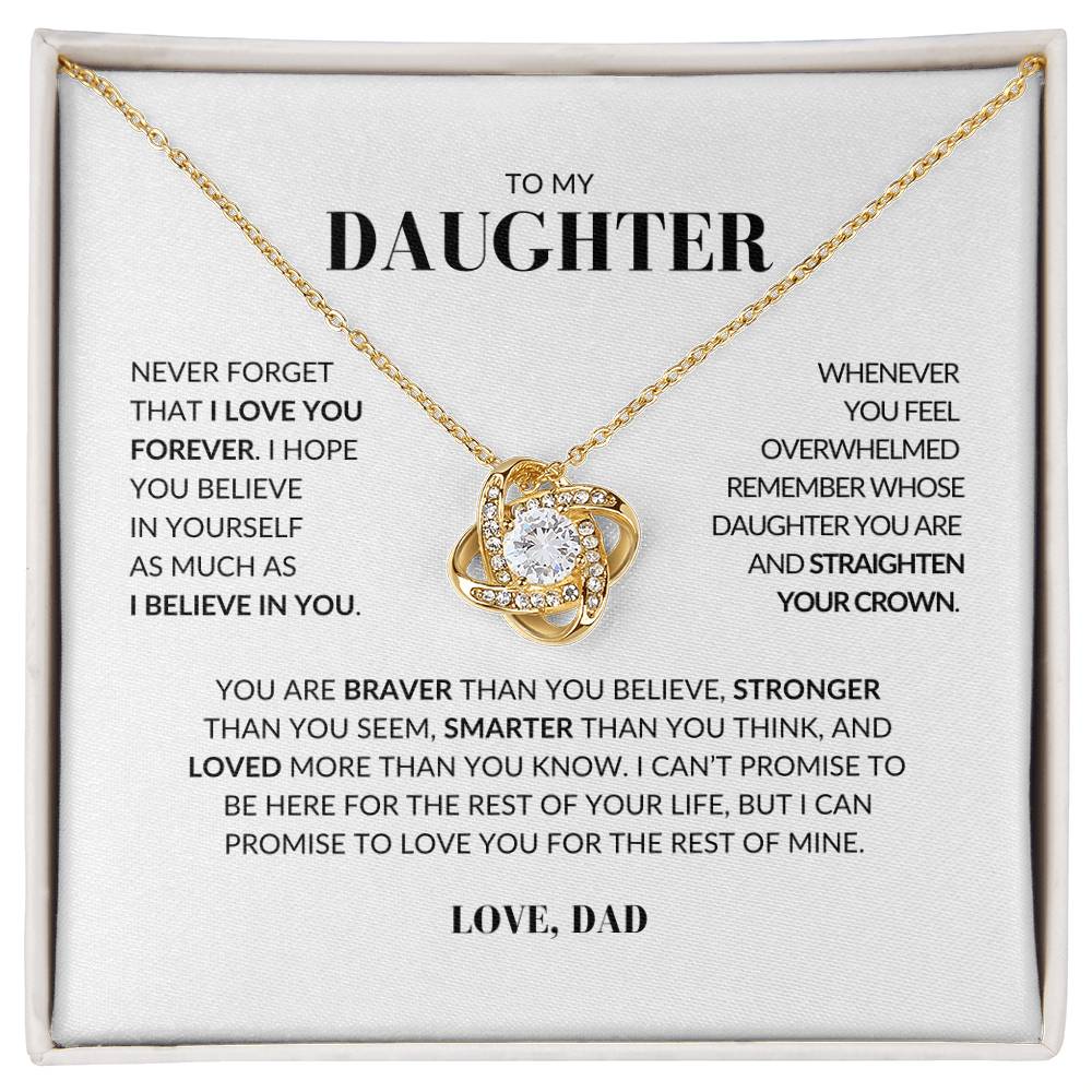 Never forget that I love you forever. I hope you believe in yourself as much as I believe in you. Whenever you feel overwhelmed remember whose daughter you are and straighten your crown. You are braver than you believe, stronger than you seem, smarter than you think, and loved more than you know. I can't promise to be here for the rest of your life, but I can promise to love you for the rest of mine.