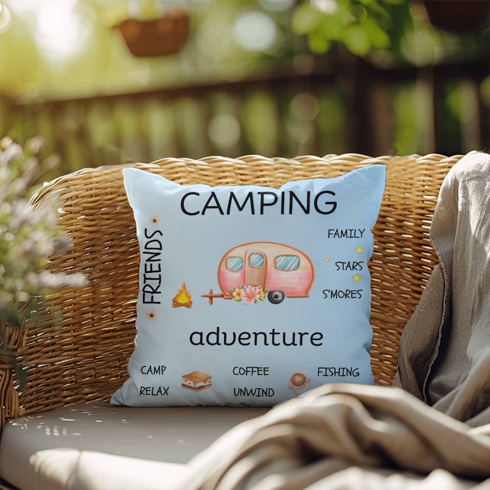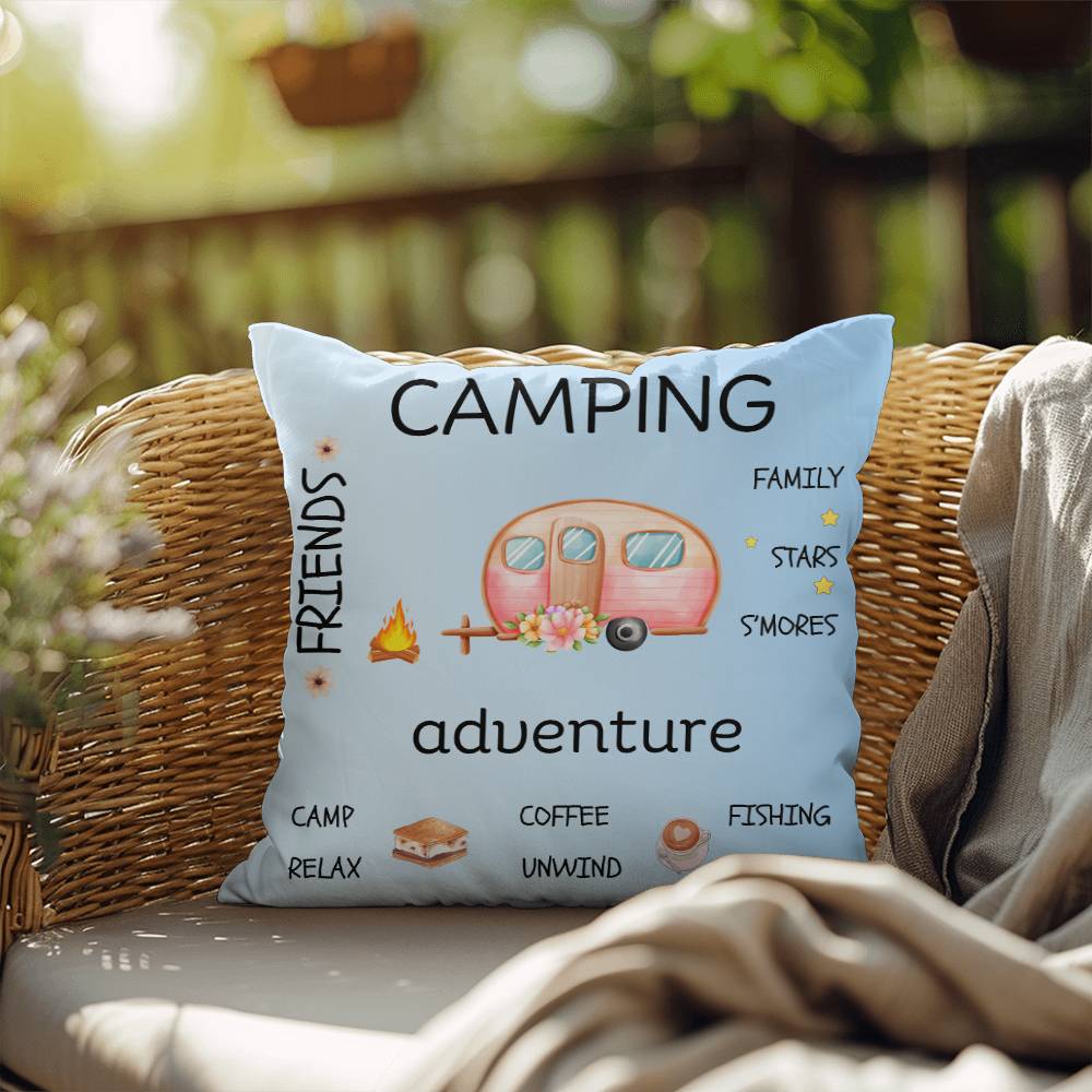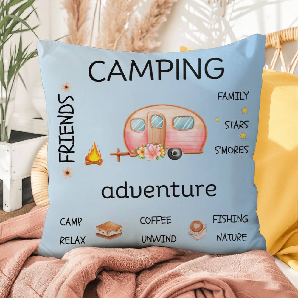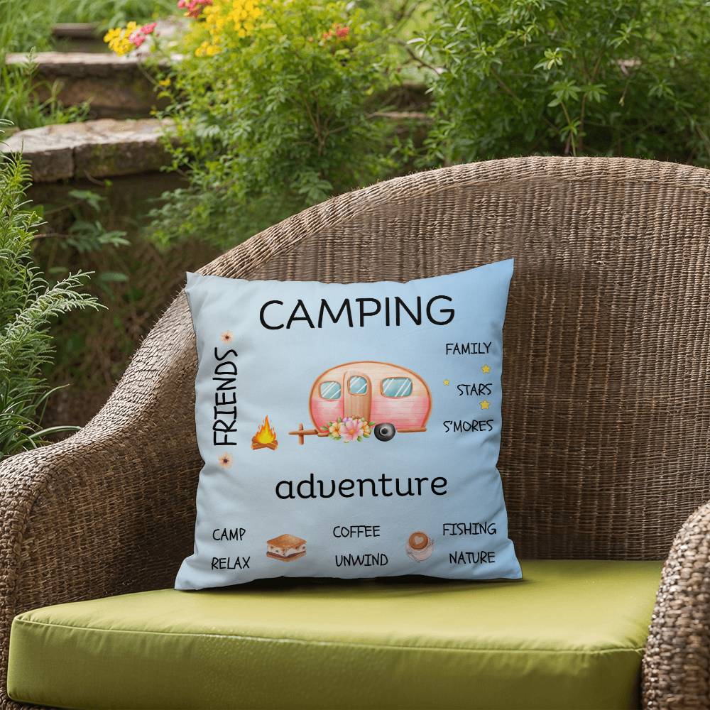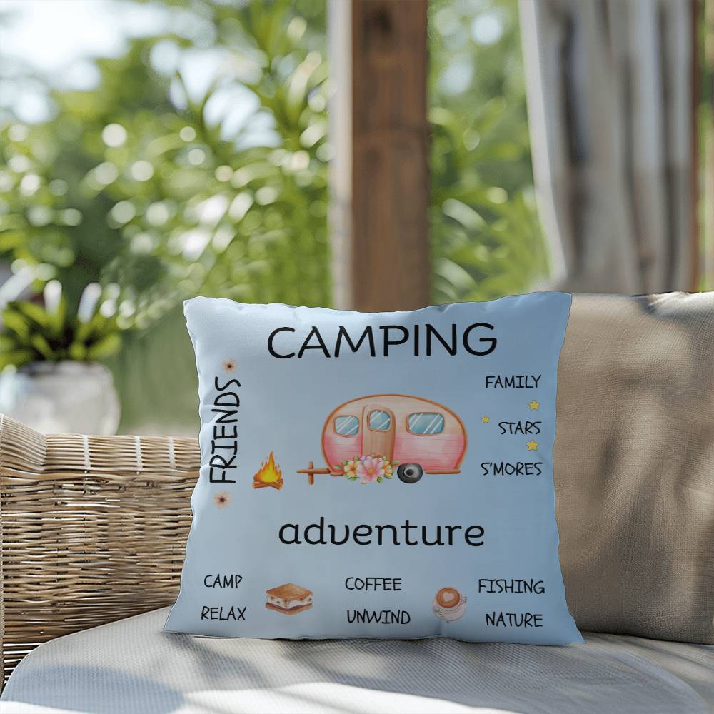 Crafted from weather-resistant material, this pillow is equally at home on your patio furniture or adorning your indoor sofa. The vibrant blue hue serves as a canvas for a delightful scene featuring a retro camper surrounded by words and elements that capture the essence of camping—think cozy campfires, starry nights, and the great outdoors.